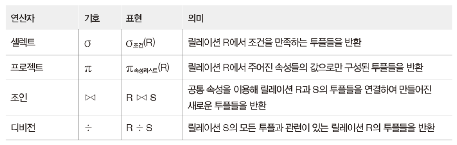 - 릴레이션을 처리하는 연산자들의 모임: 일반 집합 연산자, 순수 관계 연산자