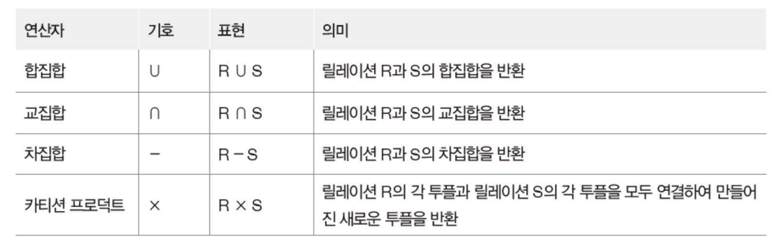 - 2개의 릴레이션을 대상으로 연산 수행 -> 피연산자가 2개 필요