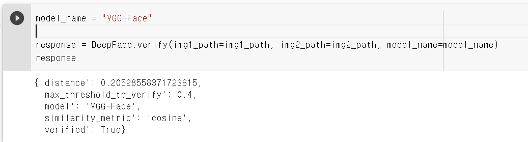다행히 distance_metric 를 바꾸니 verified 값이 True로 나오긴 합니다.. 실제 본격적인 프로젝트 개발을 진행할 때는 모델 뿐만 아니라 distance_metric도 함께 고려해서 최상의 성능을 내는 조합을 잘 찾아야겠습니다..😂