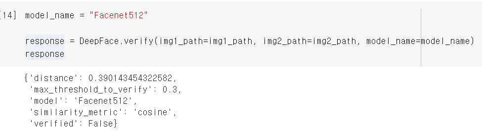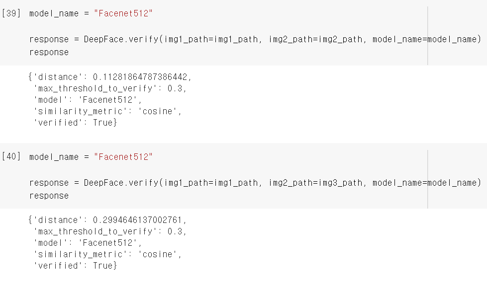그리고 아까 제대로 나오지 않았던 Facenet512 모델을 썼는데..! 다행히 둘 다 결과가 잘 나오는 걸 확인할 수 있었습니다. 다만 img3랑 비교한 경우에는 distance가 아주 아슬아슬하게 threshold 안에 들어왔네요..ㅎㅎ